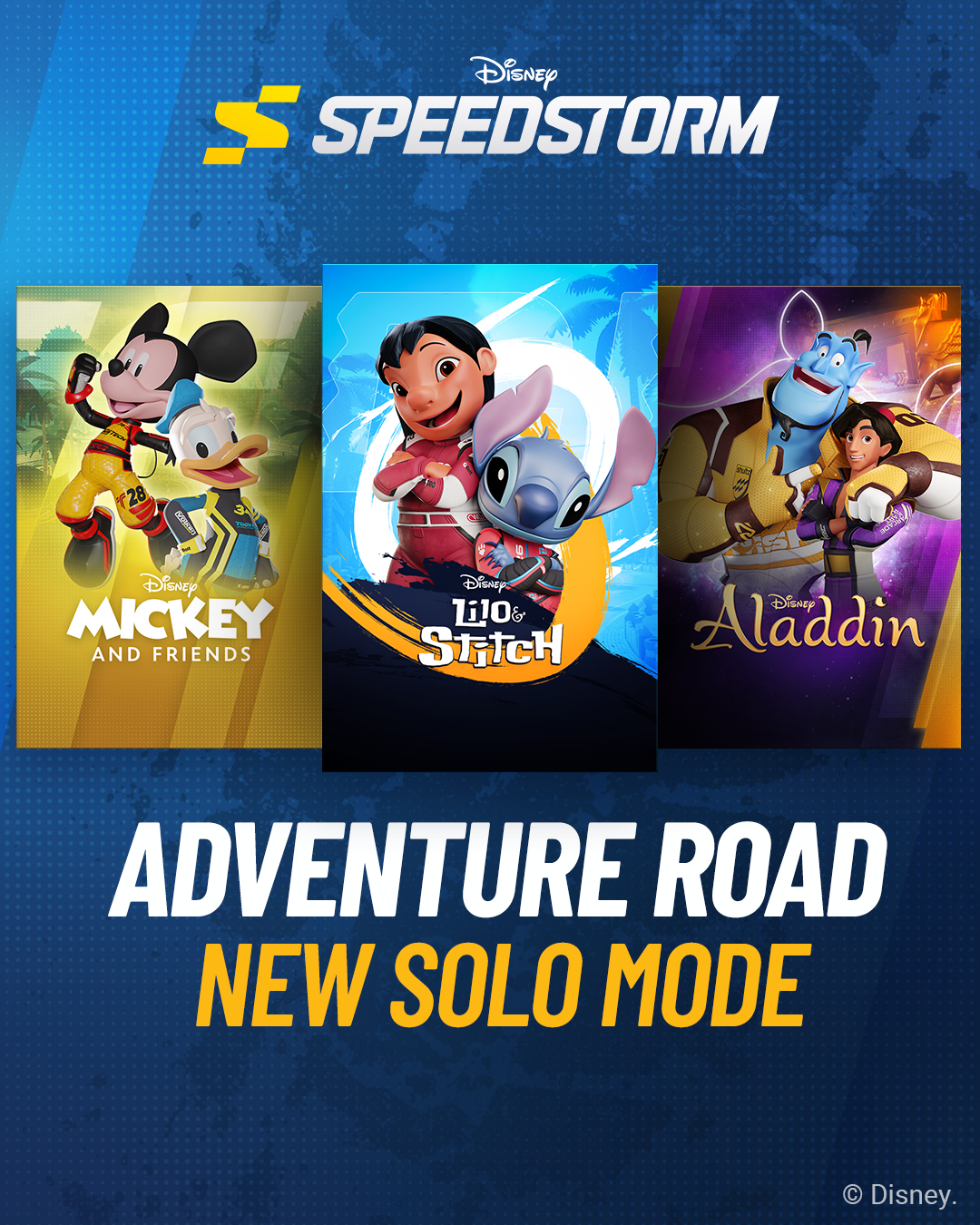 We’re thrilled to announce a brand-new Solo mode in Disney Speedstorm – Adventure Road! This exciting new game mode will offer you a fantastic collection of racing challenges and missions, designed to expand your experience with your favorite Racers.